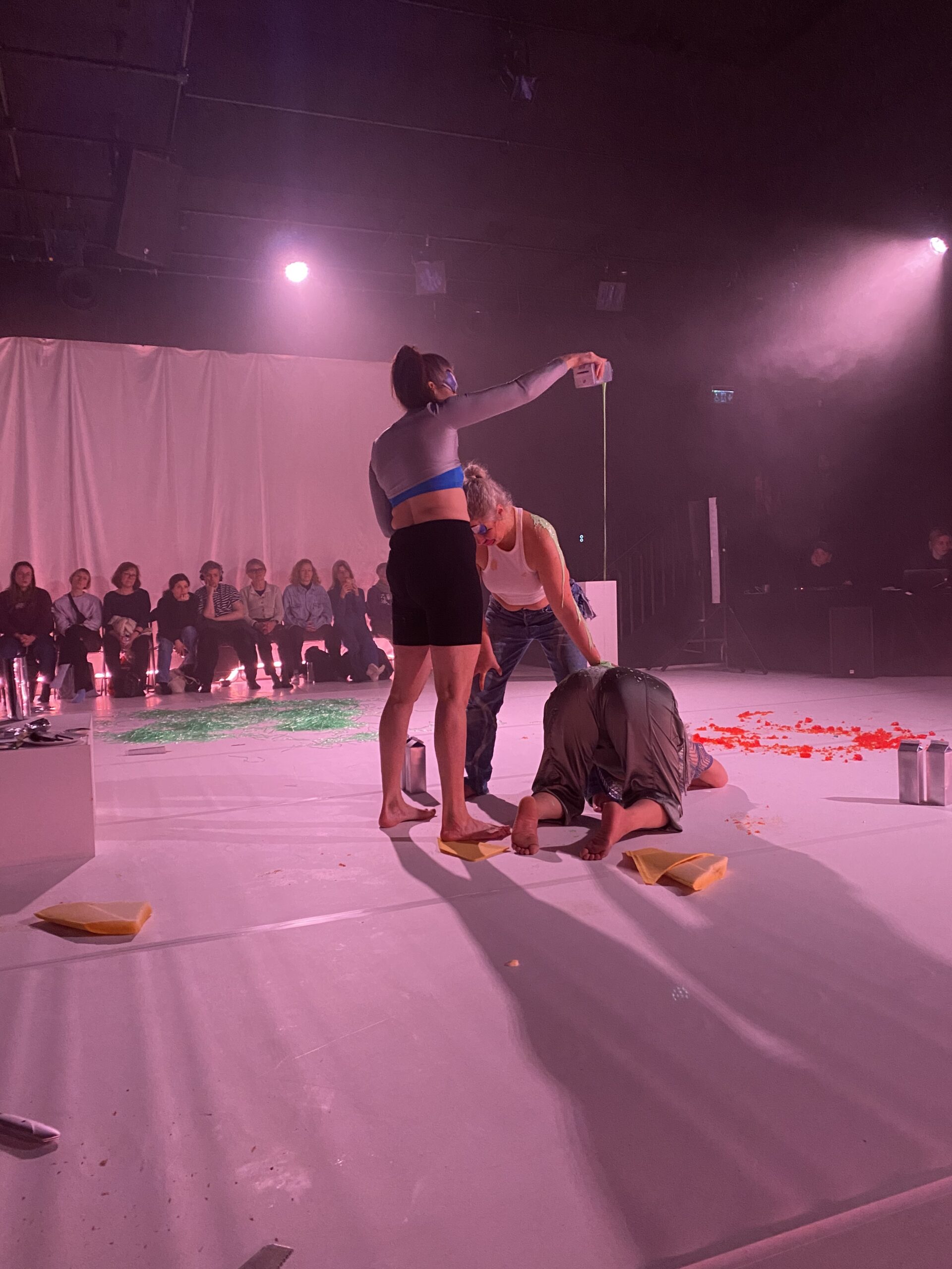 Death drive, desolation and eroticism. The erotic potential of destruction forms the core of Sepideh Khodarahmis first group piece. Inside a pulsing universe of decadence the dancers Maria Naidu, Maria af Klintberg and Annika B. Lewis move their bodies through heavy bass and hazy club music. A playful laboratorium emerges; a charting of choreographies of destruction and seduction.